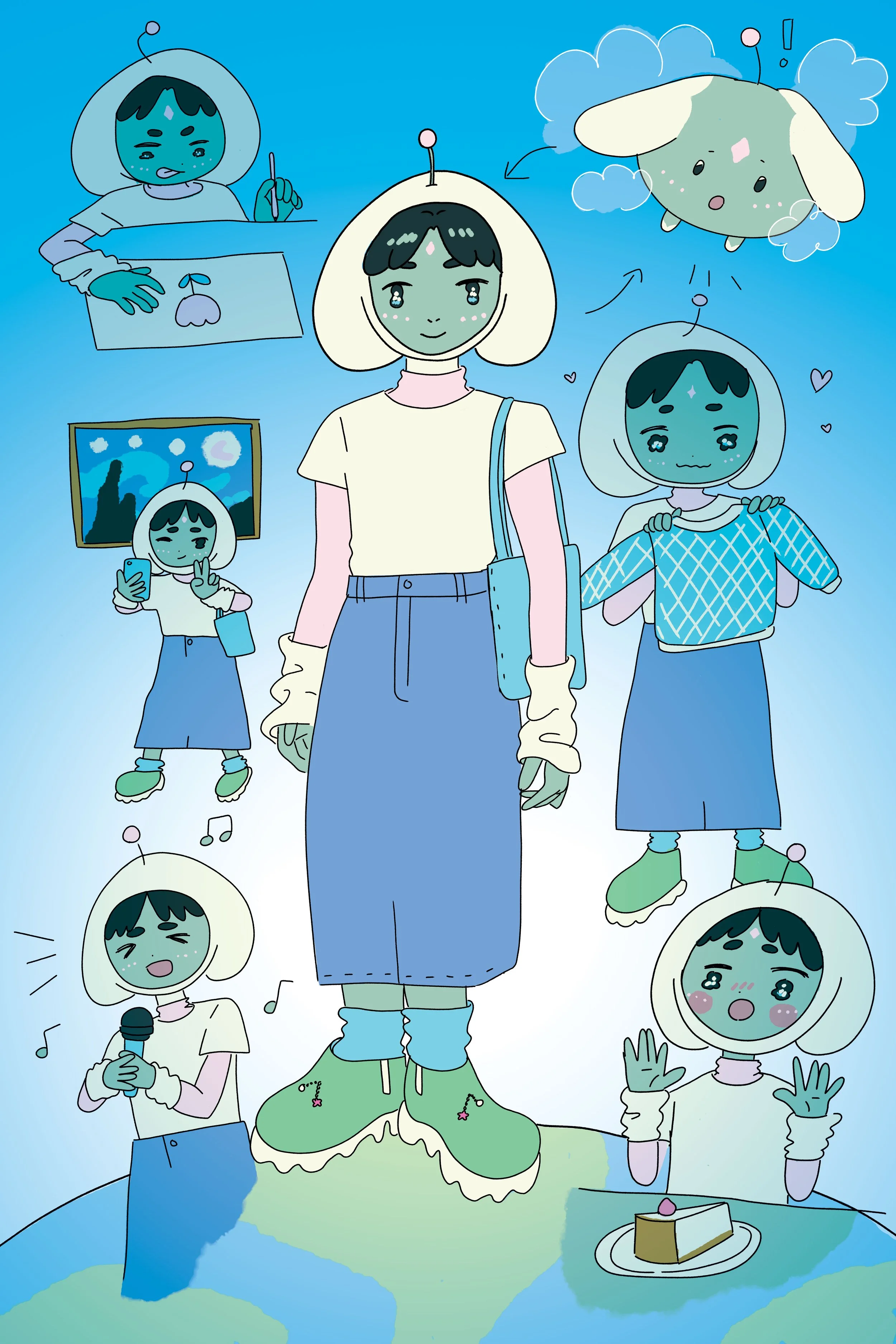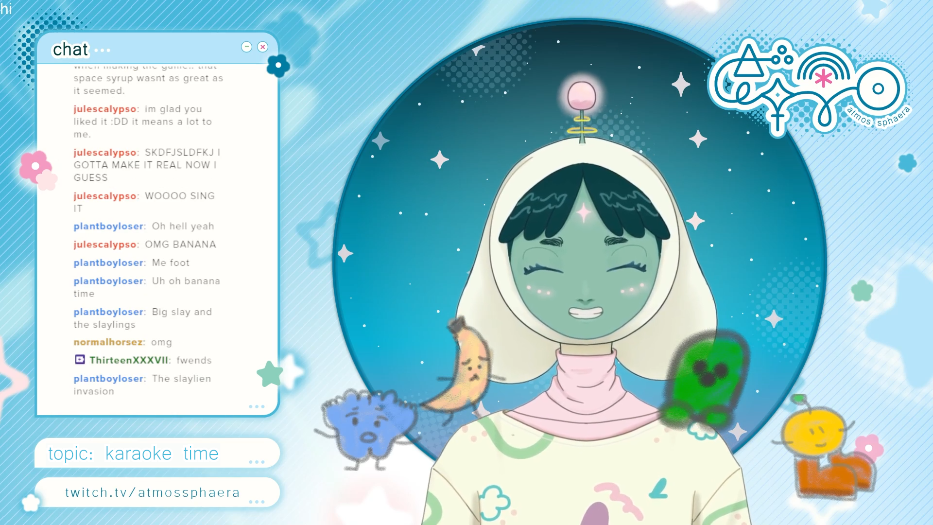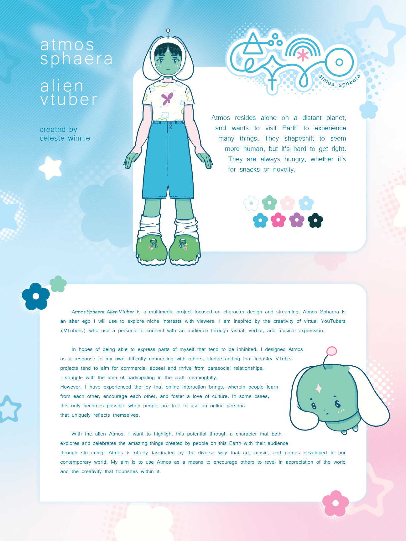 To bring Atmos Sphaera to life, I brought together the disciplines of character design, illustration, branding, 2D animation rigging, motion capture animation, and live streaming. Inspired by the techno-optimism of the early 2000s, Atmos’s visual identity uses motifs such as flat pop art and character design conventions from anime that seek to bridge a love for things passed to a bright future. These design choices draw on inspirations both meaningful to me and trendy in the contemporary art and design space.