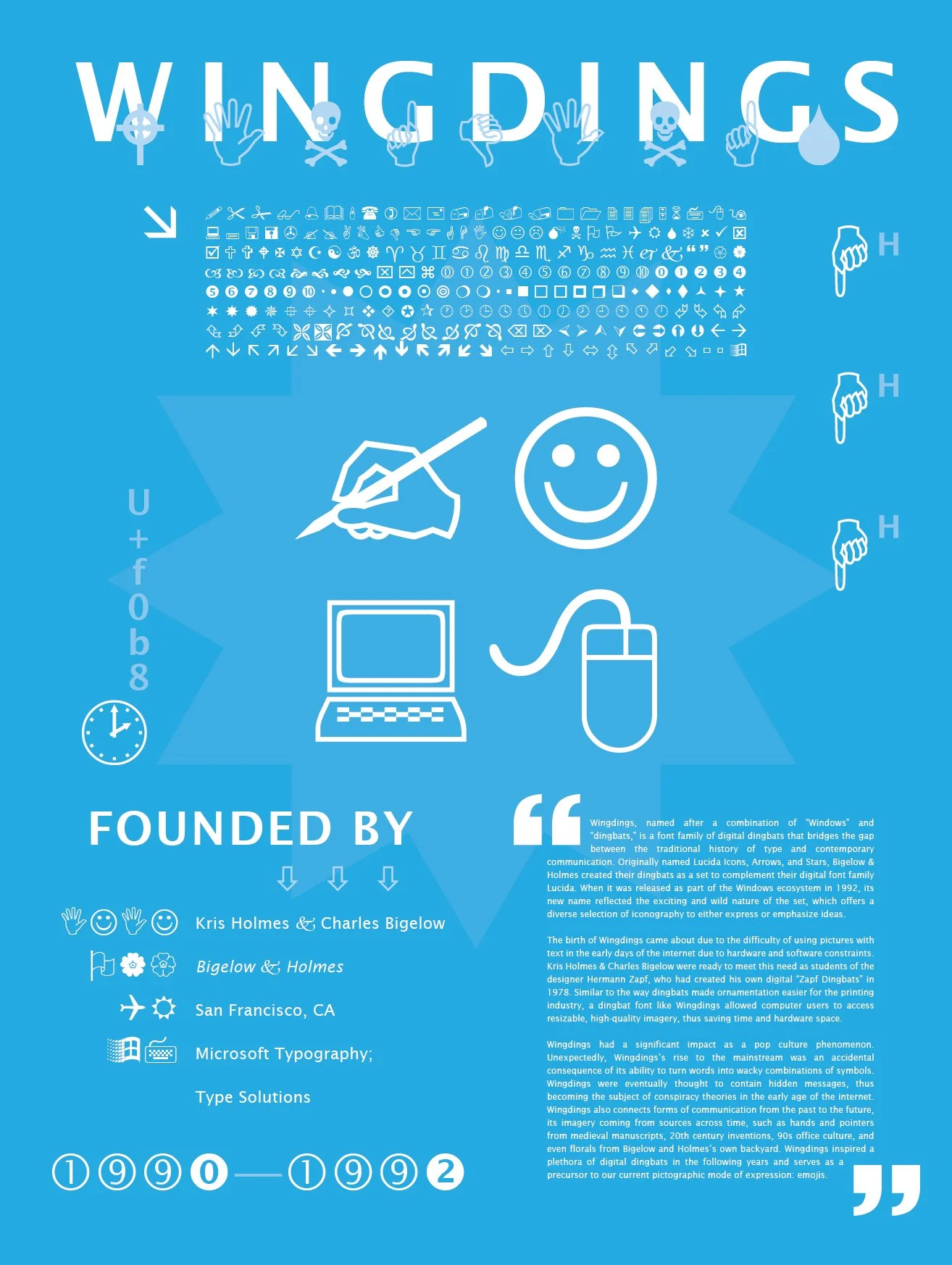 A poster on the history and impact of the typeface Wingdings while utilizing it in the poster to showcase its qualities. The challenge of this poster was to use the typeface when it is not suitable for readable text. However, this unlocked its potential as a pictographic tool, and I utilized the symbols both to represent its accompanying text and as graphical elements to engage the viewer’s eye.